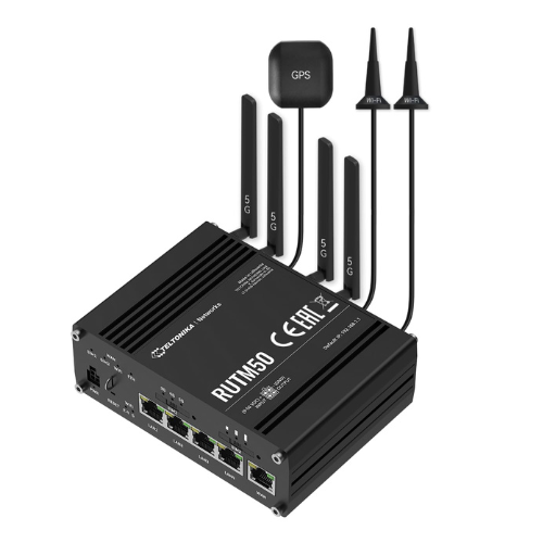 • Teltonika Networks RUTM50 — נתב 5G תעשייתי עם Wi-Fi 5 ו-Gigabit לכל היציאות.